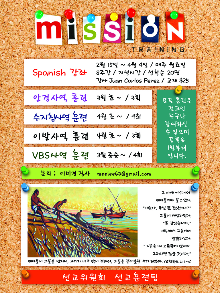 선교에 관심있으신 성도님들을 위해 여러 훈련프로그램들이 시작됩니다(스페니쉬, 안경사역, 수지침사역, 이발사역, VBS 사역).
