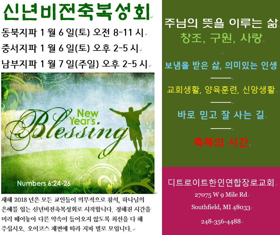 새해 2018년은 모든 교인들이 의무적으로 참석, 하나님의 은혜를 입는 신년비전축복성회로 시작합니다.