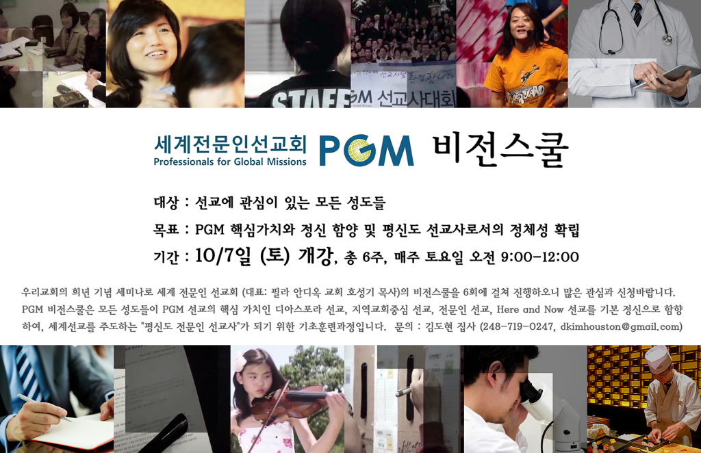 10 월 7 일(토)부터 6 회에 걸쳐 평신도 전문인 선교사가 되기 위한 기초훈련과정을 제공합니다.
